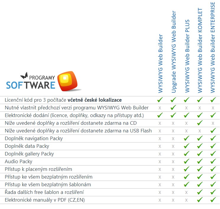 WYSIWYG Web Builder - porovnání jednotlivých verzí